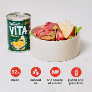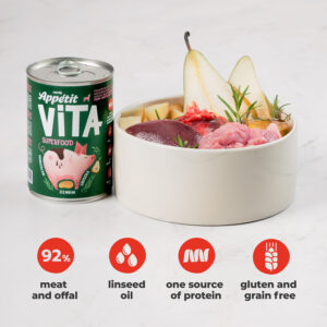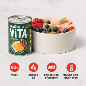 The addition of raspberries, blueberries, carrots and apples is a wealth of valuable nutrients. Sage and rosemary add a unique aroma and stimulate the appetite. With Comfy Appetit Vita wet food, your dog will be able to enjoy not only a tasty, but also a wholesome meal that brings numerous benefits to his health!
