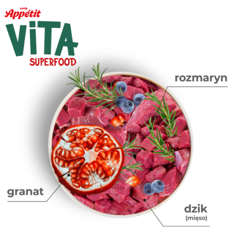 Dodatek malin, borówek, marchwi i jabłka to bogactwo cennych składników odżywczych. Szałwia i rozmaryn dodają wyjątkowego aromatu i pobudzają apetyt. Dzięki karmie mokrej Comfy Appetit Vita Twój pies będzie mógł cieszyć się nie tylko smacznym, ale i pełnowartościowym posiłkiem, który przynosi liczne korzyści dla jego zdrowia!